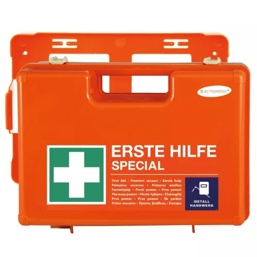 Elsősegély koffer DIN 13157 szerint feltöltve az egyes szakterületek igényeihez kapcsolódó további speciális tartalommal pornak és fröccsenő víznek ellenálló ABS kofferben fali tartóval.