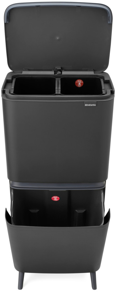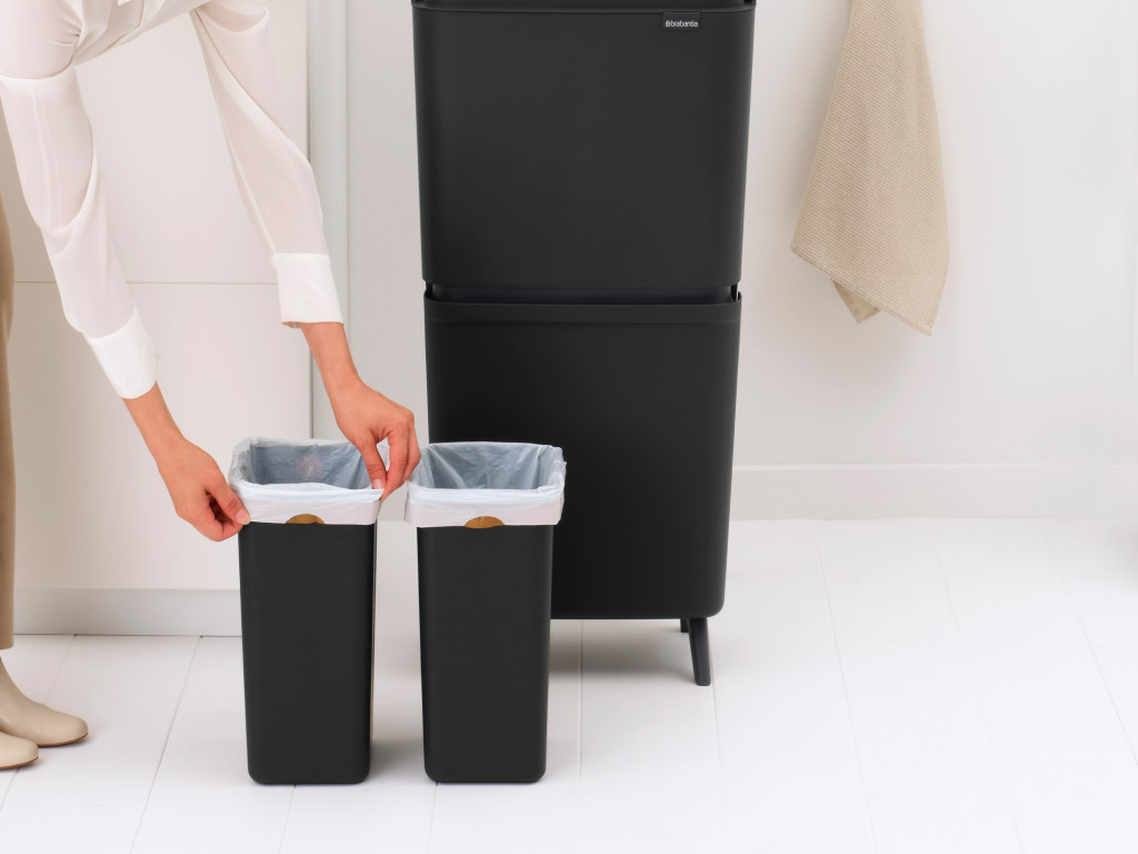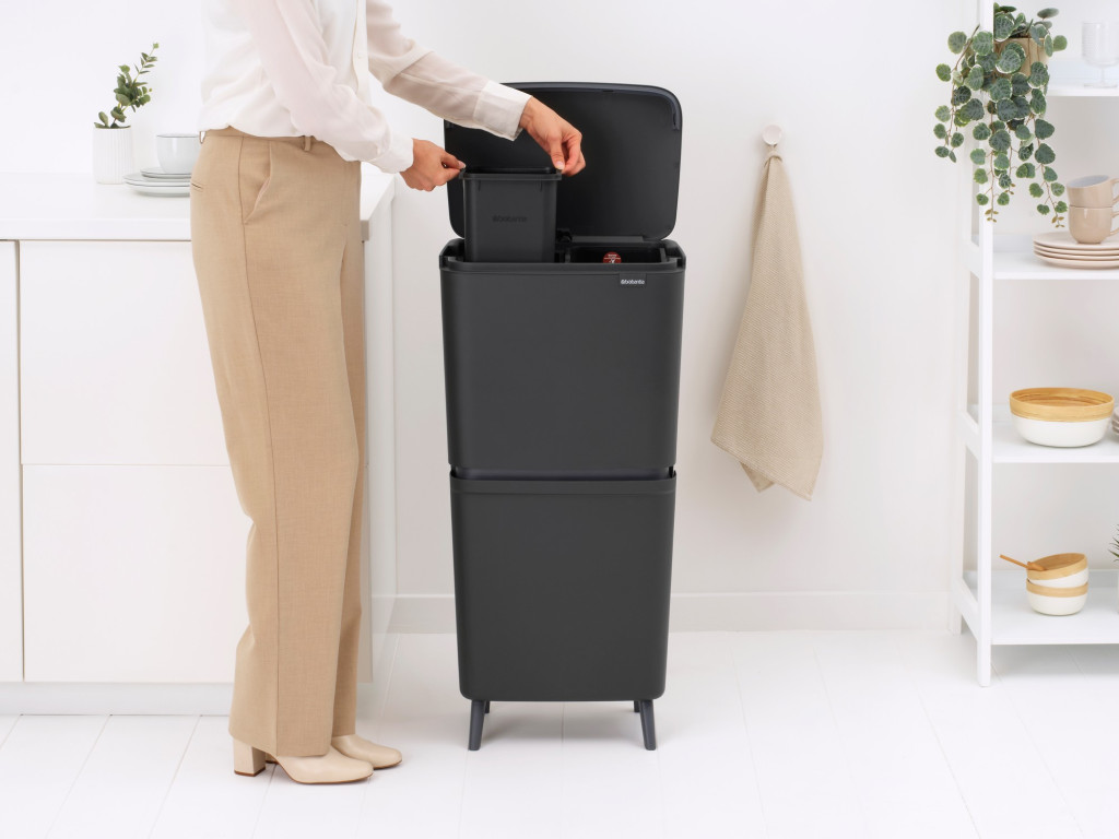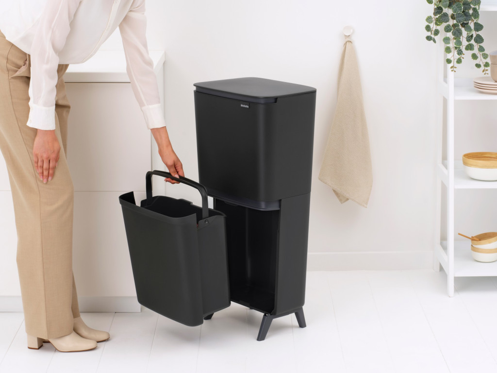 A Brabantia SortUp Recycle Bin Hi nem csupán egy szemetes, hanem egy intelligens hulladékkezelő rendszer, amely függőlegesen terjeszkedik, így minimális alapterületet foglal el. A magasított lábaknak köszönhetően nem kell mélyre hajolnia, a modern sötétszürke szín pedig ipari eleganciát és letisztult harmóniát visz az enteriőrbe.