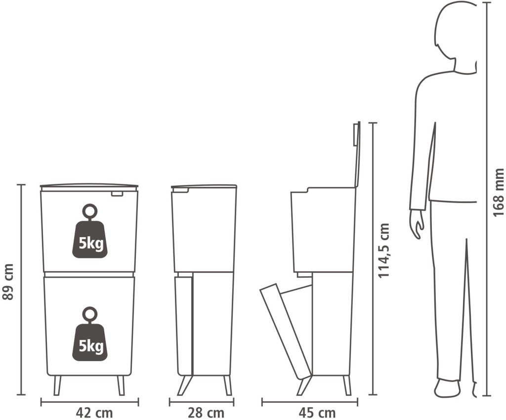 A két különálló rekesz (egy 20 literes és egy 25 literes) egymás feletti elhelyezése lehetővé teszi a különböző hulladéktípusok – például papír és műanyag – elkülönítését anélkül, hogy két külön kukát kellene kerülgetnie. A szögletes, falhoz simuló forma és a kompakt méret ideálissá teszi a SortUp-ot a modern, városi otthonokba és a minimalista belső terekbe.