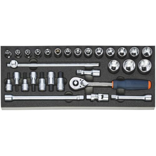 A szokásos szerszámkészletek kétszínű PE keményhab betétben. A zártpórusú hab olajjal szemben ellenálló és semmilyen folyadékot nem szív magába. Antracit fedőréteg, az alsó kék kontrasztszín a hiányzó szerszámokat jelzi.