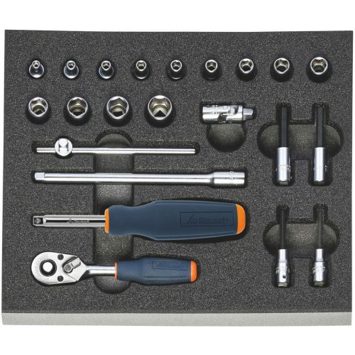 A szokásos szerszámkészletek kétszínű PE keményhab betétben. A zártpórusú hab olajjal szemben ellenálló és semmilyen folyadékot nem szív magába. Antracit fedőréteg, az alsó kék kontrasztszín a hiányzó szerszámokat jelzi.