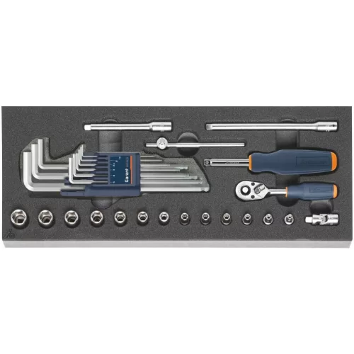 A szokásos szerszámkészletek kétszínű PE keményhab betétben. A zártpórusú hab olajnak ellenáll és semmilyen folyadékot nem szív magába. Antracit fedőréteg, az alsó szürke kontrasztszín a hiányzó szerszámokat jelzi.