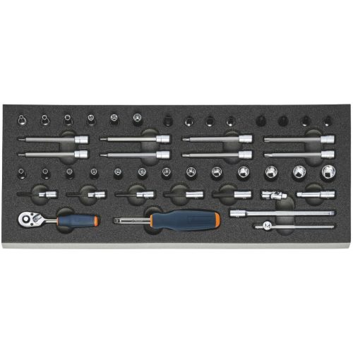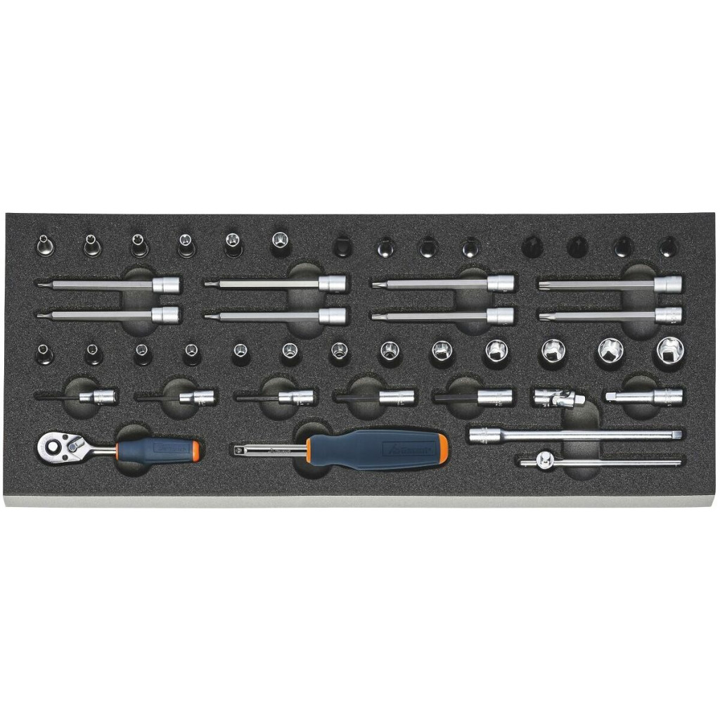 A szokásos szerszámkészletek kétszínű PE keményhab betétben. A zártpórusú hab olajnak ellenáll és semmilyen folyadékot nem szív magába. Antracit fedőréteg, az alsó szürke kontrasztszín a hiányzó szerszámokat jelzi.