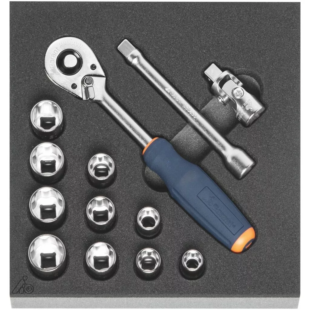 A szokásos szerszámkészletek kétszínű PE keményhab betétben. A zártpórusú hab olajnak ellenáll és semmilyen folyadékot nem szív magába. Antracit fedőréteg, az alsó szürke kontrasztszín a hiányzó szerszámokat jelzi.