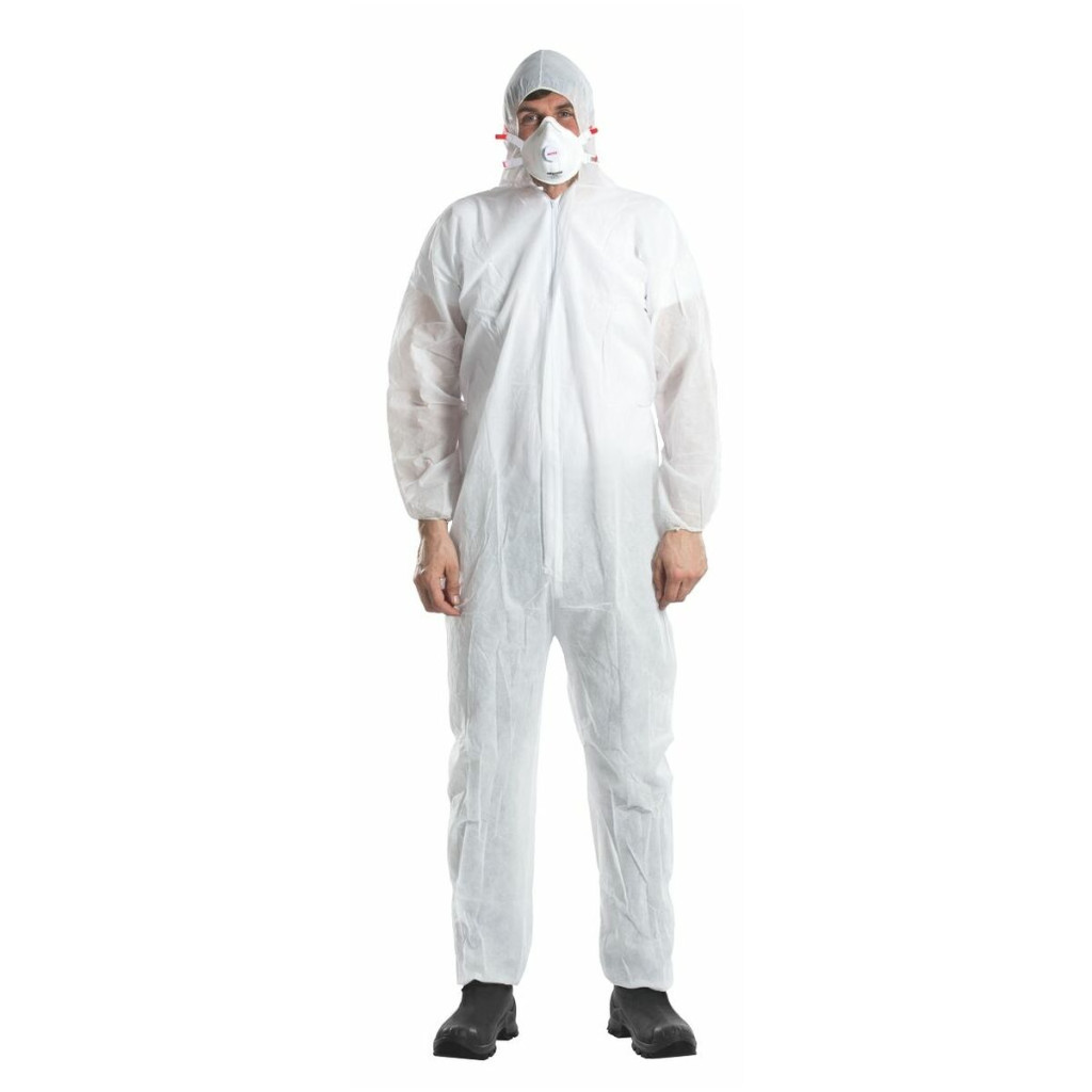 Egyszer használatos polipropilén overál kar-, láb- és derékgumival.