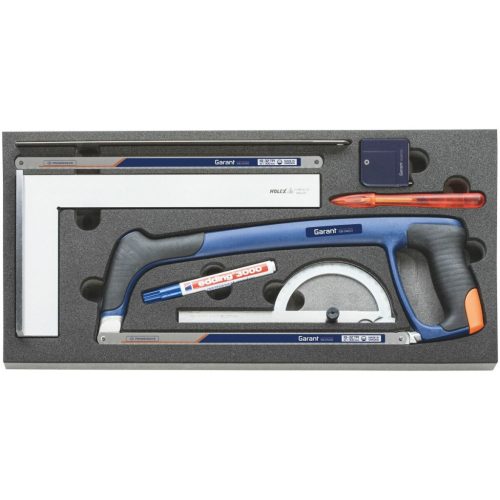 A szokásos szerszámkészletek kétszínű PE keményhab betétben. A zártpórusú hab olajnak ellenáll és semmilyen folyadékot nem szív magába. Antracit fedőréteg, az alsó szürke kontrasztszín a hiányzó szerszámokat jelzi.