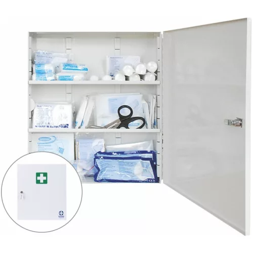 Egyajtós kötszeres szekrény robusztus acéllemezből, jobbra nyílik. Biztonsági zárral és két kulccsal. Szín: fehér festett zöld elsősegély szimbólummal.