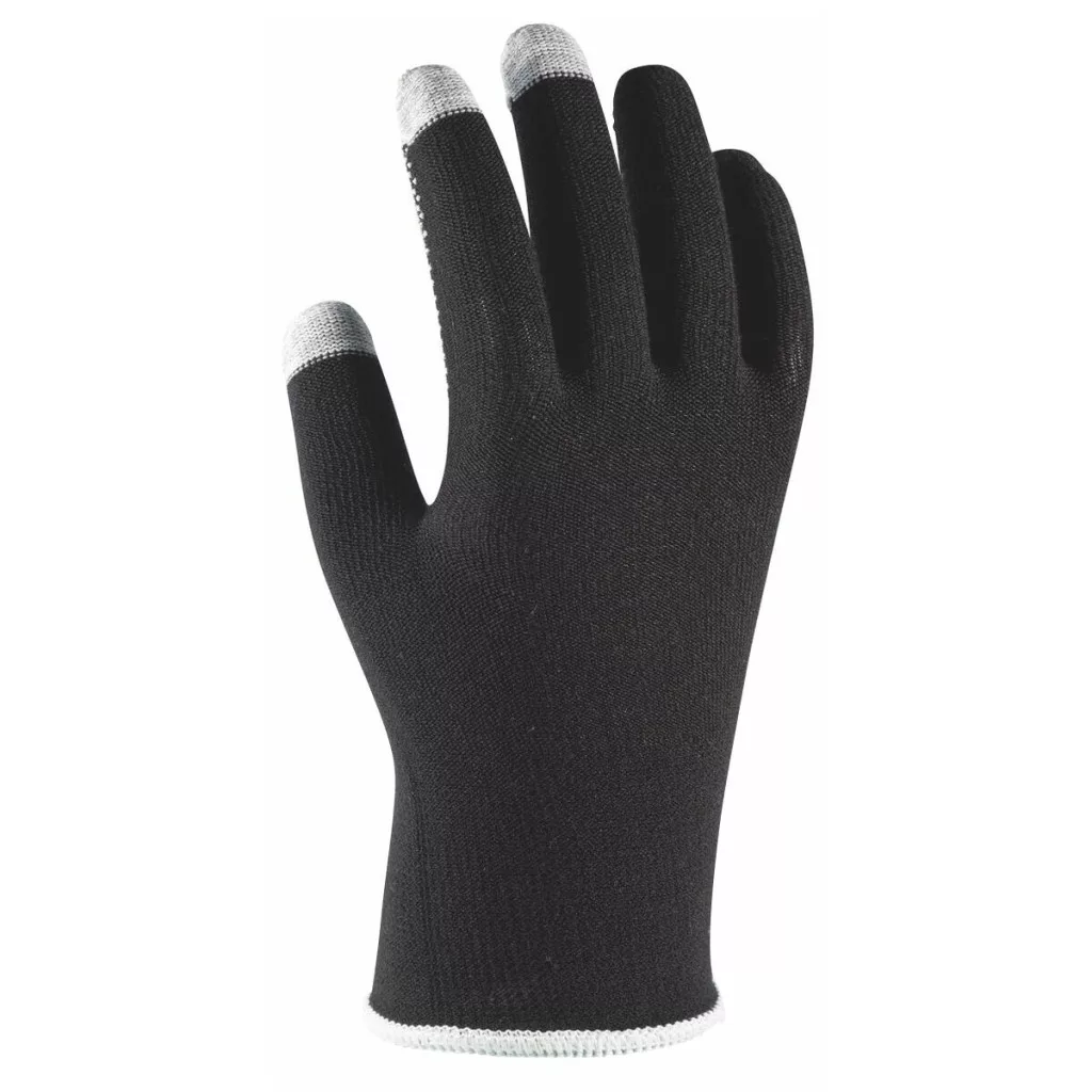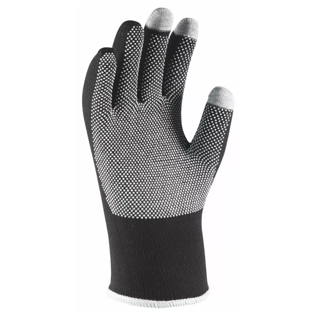 6102. Fekete pamut / elasztán finom kötésű kesztyű, egyik oldalon fehér PVC érdesítéssel a jó tapadás érdekében. Az integrált szénszálnak köszönhetően érintőképernyőhöz alkalmas az ujjbegyeknél (hüvelykujj, mutatóujj, középső ujj).