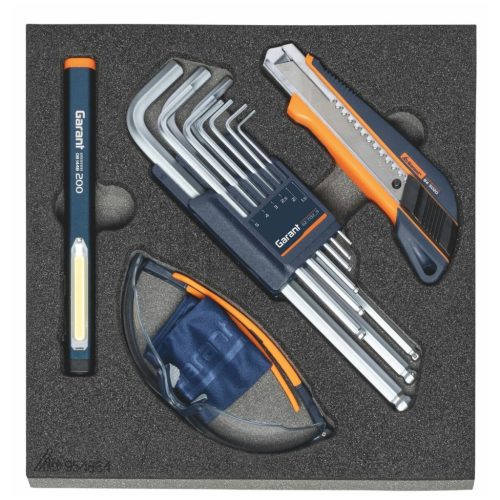 A szokásos szerszámkészletek kétszínű PE keményhab betétben. A zártpórusú hab olajnak ellenáll és semmilyen folyadékot nem szív magába. Antracit fedőréteg, az alsó szürke kontrasztszín a hiányzó szerszámokat jelzi.