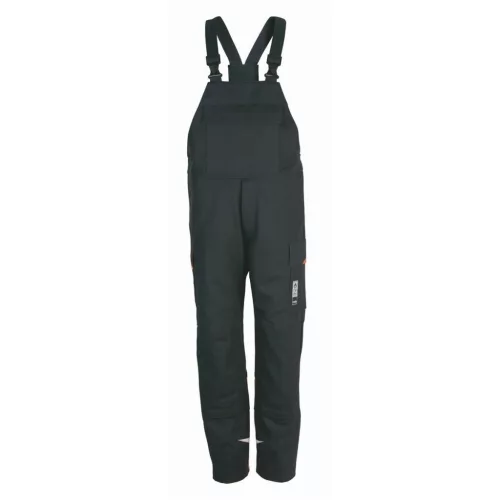 Hegesztővédő kantáros nadrág sötét antracit / szürke színben 330 g/m² textil grammatúrával, EN 11611, 1. kategória szerinti tanúsítással a 091487 sz. alatt.