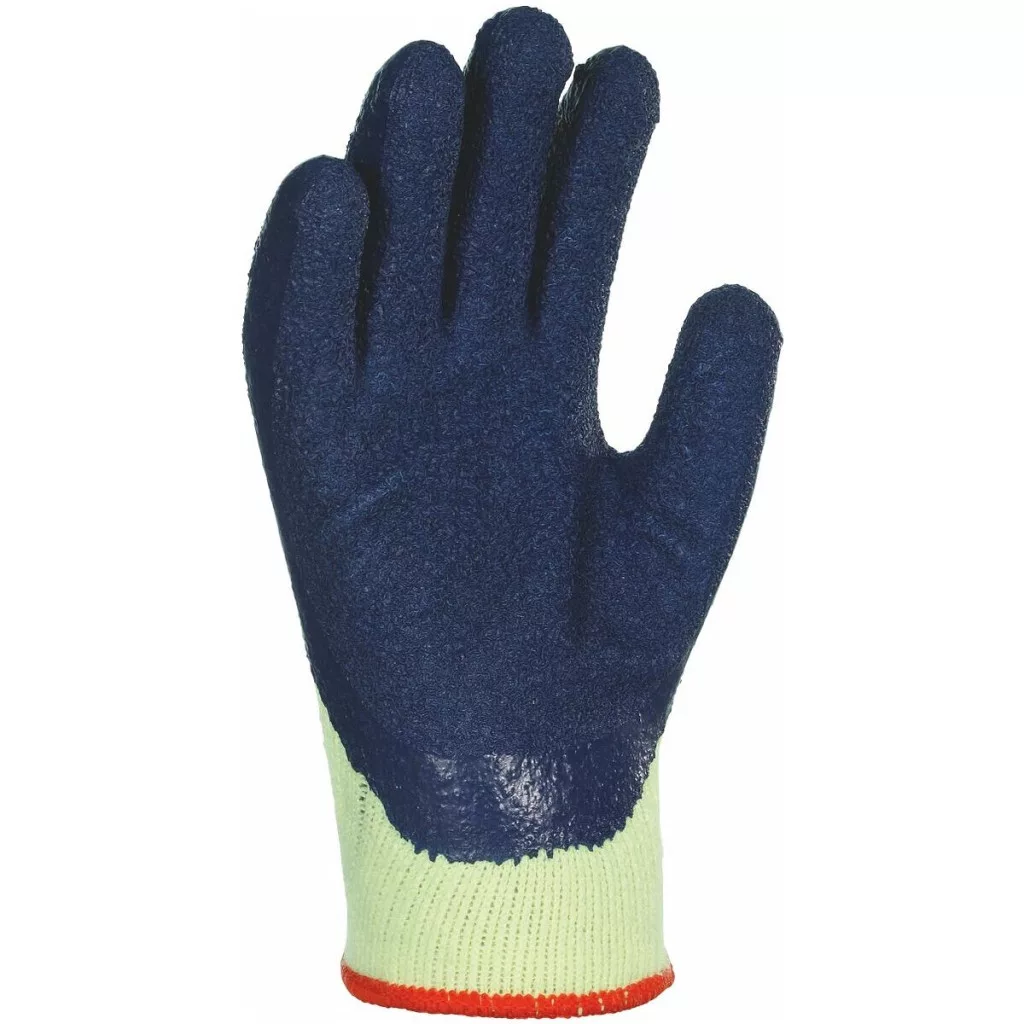 1603 W. Varrat nélküli hideg elleni védőkesztyű latex bevonattal. Az érdesített bevonat nagyon jó fogásbiztonságot nyújt olajos munkadarabokkal végzett munka esetén. Jól látható a neonsárga hordozóanyagnak köszönhetően.