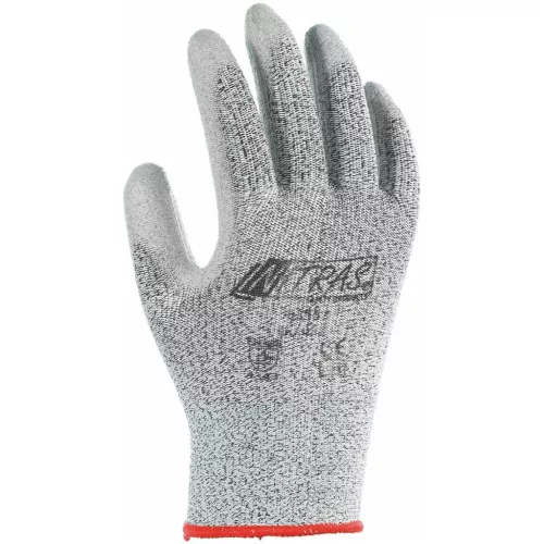 6315. Vágás elleni védőkesztyű, kényelmes viselet. Részleges szürke PU bevonat a jó fogás érdekében száraz és enyhén nedves munkakörnyezetben. Nem alkalmas olajos alkatrészek mozgatásához.