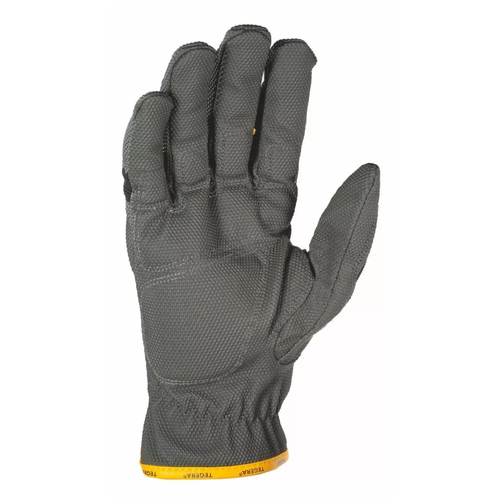 Tegera® 9125. Vízlepergető szintetikus bőrből (Microthan®) készült kesztyű párnázott tenyérrel. Strukturált felület a jobb tapadás érdekében száraz és nedves felületeken. Fényvisszaverő csíkok a kézfejen a jobb láthatóság érdekében. Rövid modell megerősített mutatóujjal.