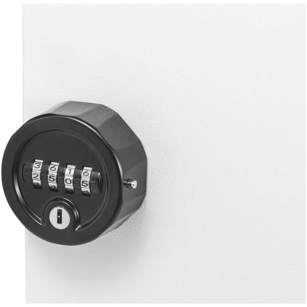 Acéllemez váz, válaszfal és ajtó. Fali rögzítéshez előkészítve. Belső borítás polipropilén lemezekkel. Fokozatmentesen állítható magasságú akasztós léc, folyamatos számozással és kulcsregiszterrel.