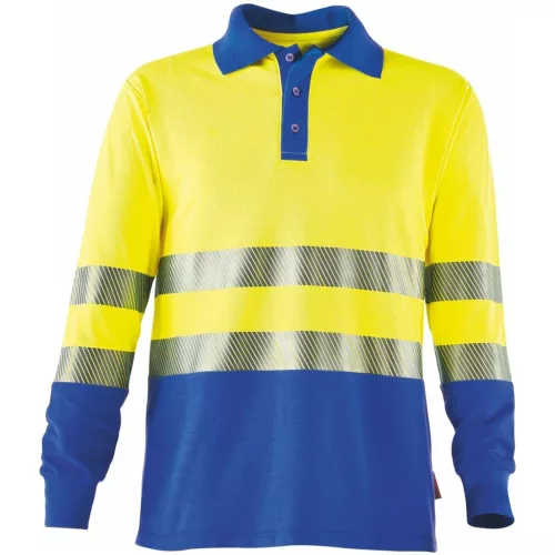 Hosszú ujjú multinorm galléros póló hő, láng és ívfény elleni védelemhez. Elektrosztatikus tulajdonságokkal. Szegmentált és táguló fényvisszaverő elemek.