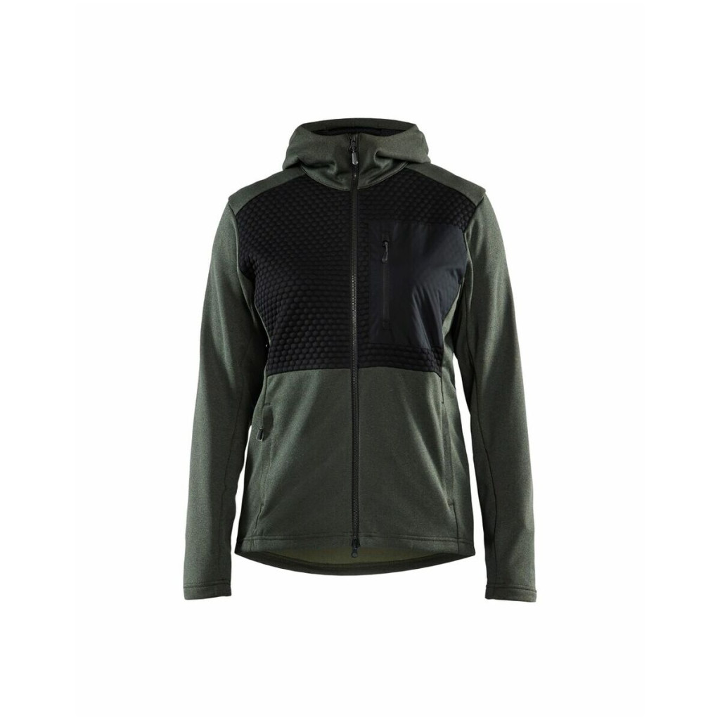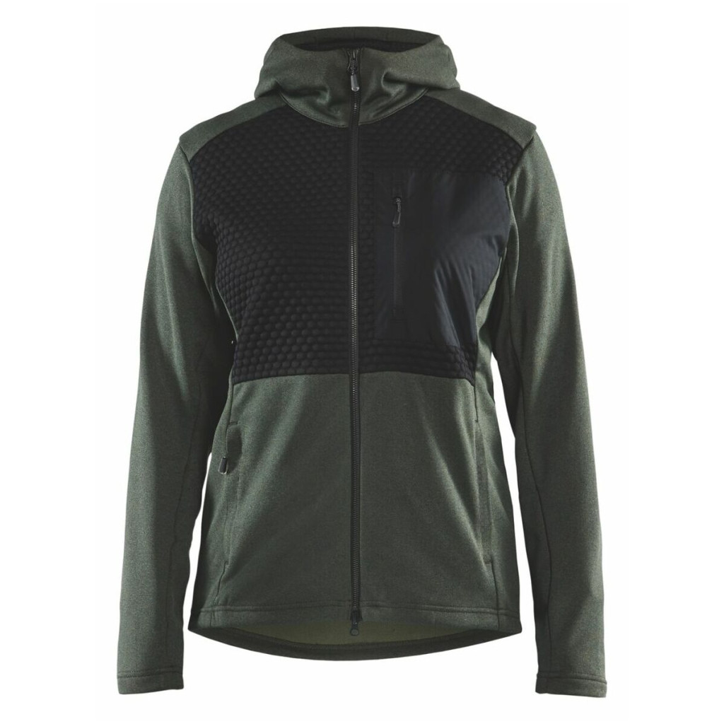 Modern női kardigán kapucnival és valamivel hosszabb nyakkal. 100% poliészter fleece. Fekete, visszafogott fényvisszaverő elemekkel az elülső oldalon és a kapucnin.