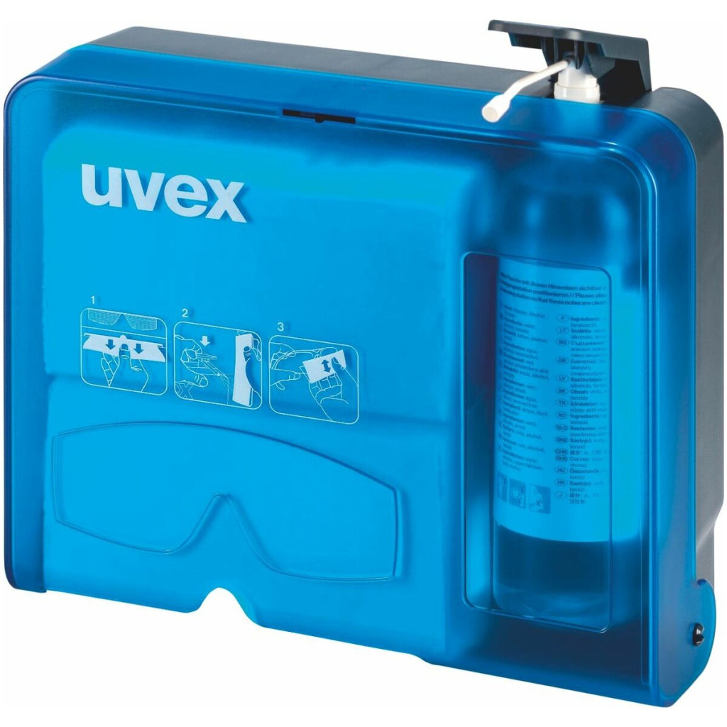 Praktikus, falra szerelhető tisztító állomás pumpás adagolóban lévő tisztító folyadékkal és szilikonmentes tisztító papírral. Optimális védőszemüvegek rendszeres tisztításához. Piktogramok segítik az egyszerű használatot.