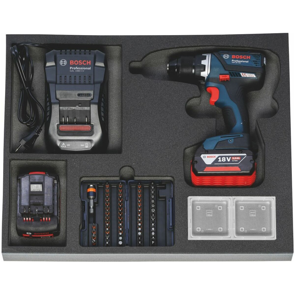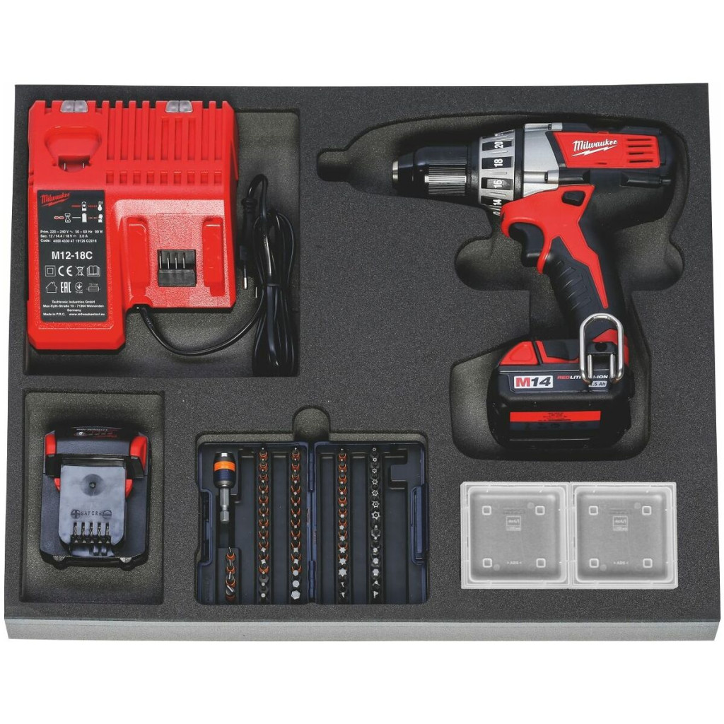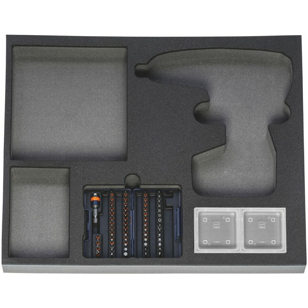 A szokásos szerszámkészletek kétszínű PE keményhab betétben. A zártpórusú hab olajnak ellenáll és semmilyen folyadékot nem szív magába. Antracit fedőréteg, az alsó kék kontrasztszín a hiányzó szerszámokat jelzi.