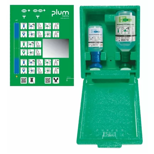 Vészhelyzeti szemállomás fali dobozban, tartalma: